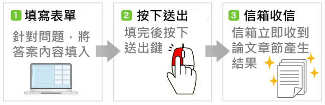 論文 架構產生器 使用注意與聲明 論文架構形成之引導性問題Phone Number*您的姓名*就讀學校及科系*電子郵件信箱*論文架構將會在自動產生後,將結果發送到這個信箱。A. 這份資料是正確的 (可以信賴的)Q-A-1:你的資料是怎麼樣收集來的?(什麼樣的實驗?統計?出處?)*Q-A-2:你這份論文是否有研究的族群或對象?*Q-A-3:你的資料是透過什麼樣的方式進行加工?(例如什麼樣的統計手法?什麼樣的圖表呈現?)*B. 這份研究是正確的 (因為有什麼樣的根據?)Q-B-1:你這份論文想要驗證的是什麼事情?*Q-B-2:依前題,是因為在什麼樣的環境下,或你看到什麼樣的資訊(可信度),才讓你覺得需要驗證這件事情?*Q-B-3:你認為你加工分析過後的數據資料,最終可以讓大家知道什麼事情?或是從這些資料來看可以得出什麼結論?*Q-B-4:你這份論文可以明確指出或證明出什麼事情?*Q-B-5:你這份論文如果無法明確指出什麼事情,那今後的課題或是今後的建議是什麼?*C. 這個研究有什麼意義(在學術背景下的價值)Q-C-1:以前有沒有已經有和這份論文有關(相關/相似)的過去研究或論文*Q-C-2:他人應該先知道什麼資訊才能理解你的論文? 或是說明你目前研究下的時空背景及環境況。*Q-C-3:這些過去的研究或論文,有什麼事情是沒有被明確指出的?*Q-C-4:這些過去的研究或論文,有什麼事情是沒有被解答到的,或是有什麼沒有說明到的?*Q-C-5:你這份論文,針對這些過去沒有被解答到,或是沒被說明到的事情,可以具有什麼樣的貢獻?*Q-C-6:你這份論文是在什麼研究領域中,所要明確驗證的研究?(和過去同樣研究的共通課題是什麼?)*Q-C-7:你這份論文的獨特的著眼點(切入點)是什麼?(和過去相似的研究有什麼不同地方在哪裡?)*D.這份研究的必要性(在社會背景下的價值)之前都沒人做過,所以我想做,或是看到過去有人做過了,但答案我不滿足,我想要更深入的去挖掘。*資料送出 論文架構形成之引導性問題您的姓名*就讀學校及科系*電子郵件信箱*論文架構將會在自動產生後,將結果發送到這個信箱。A. 研究題目是什麼?填入你的研究題目*B. 為什麼會選擇這個研究題目?B1:研究的必要性/重要性*B2:過去的研究*B3:未被解決的問題*B4:研究目的*C. 是什麼樣可取得的資料,可作為這次研究?C1:使用手段 (簡潔說明)*C2:使用手段 (詳細說明)*D.這份研究的必要性(在社會背景下的價值)D1:可取得事實 (簡潔說明)*D2:可取得事實 (詳細說明)*Email Address*E.要如何將過去的,以及這次的資料來進行對比?你會如何進數據的比對*F.可以得到什麼樣的結論?F1:可以得到的結論 (簡潔說明)*F2:可以得到的結論 (詳細說明)*G.今後的挑戰你認為經過這次的研究,未來將會看到什麼樣的挑戰,或是新的議題。*資料送出
